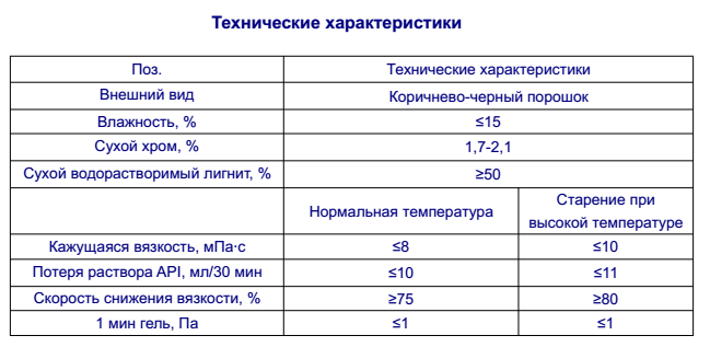 1. Данный продукт – это хорошо растворимый в воде коричнево-черный легкосыпучий порошок, модифицированный на основе природного лигнита, является одной из разновидностей средства по контролю за потерей раствора и отличным разбавителем.