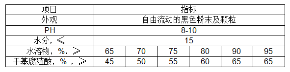 本产品为黑褐色自由流动颗粒或粉末,由腐植酸通过碱化改性后而得。